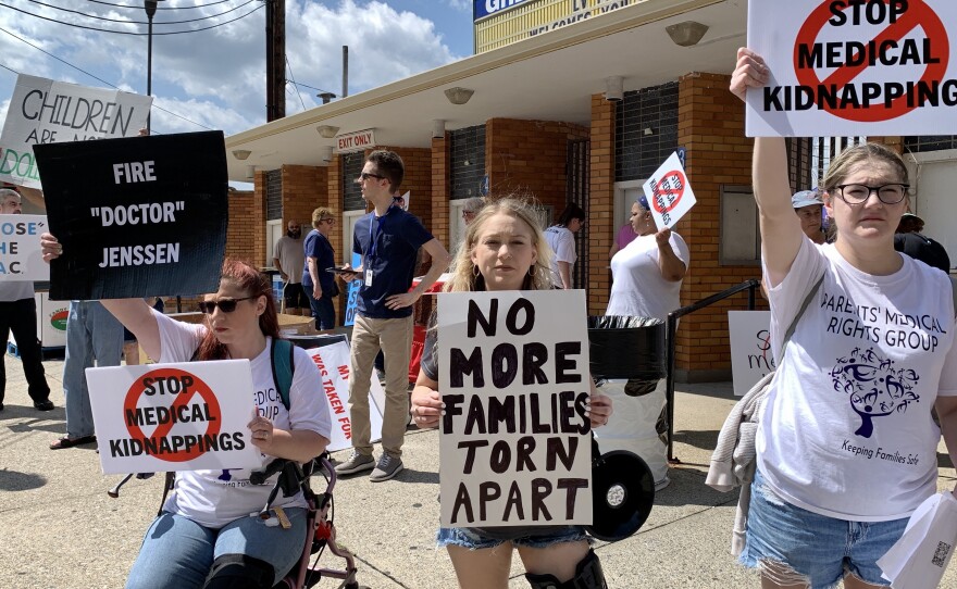 They stood across the street from the hospital’s entrance, holding signs that said, “Stop Medical Kidnapping” and “Fire Dr. Jenssen.”