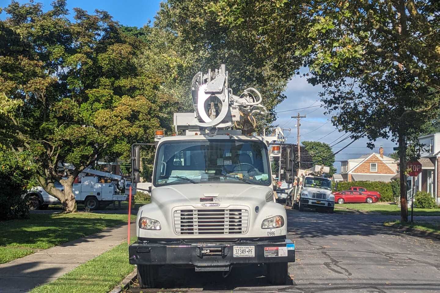 Three power trucks are staged on the street. (Stephanie Sigafoos)