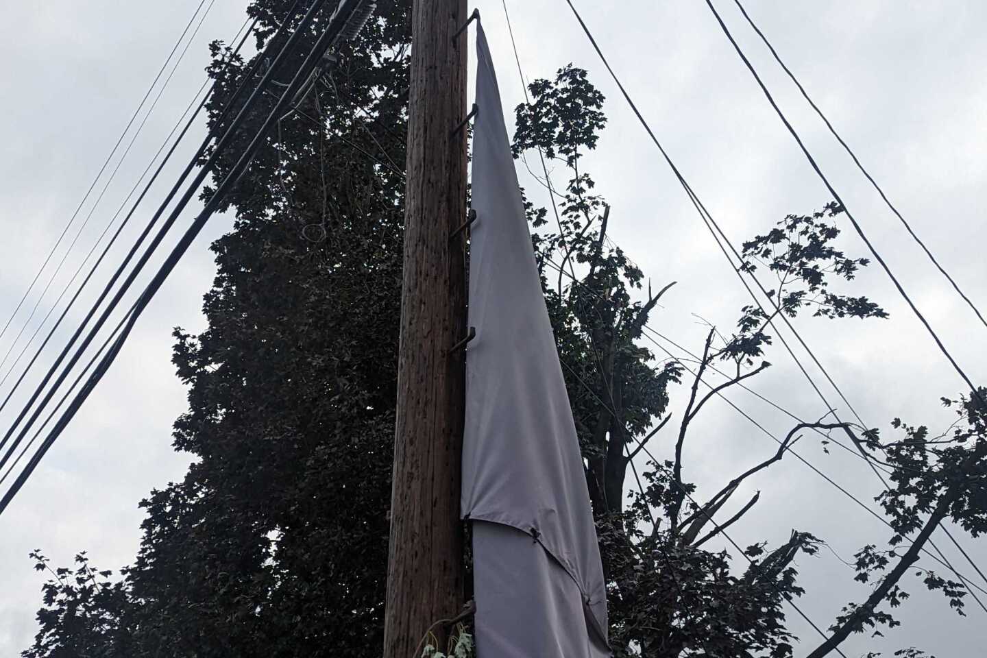Gazebo cover hanging off utility pole. (Stephanie Sigafoos)