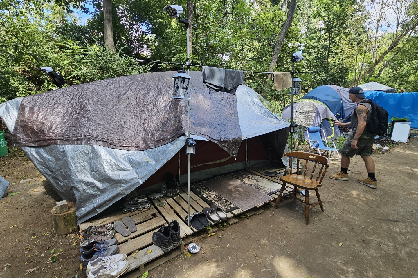 Sonny, a resident of the encampment along the Jordan Creek in Allentown, shows off his tidy tent Wednesday, Aug. 27. He's confident he can secure a job and room before the camp is shut down at the end of September. (Jason Addy)
