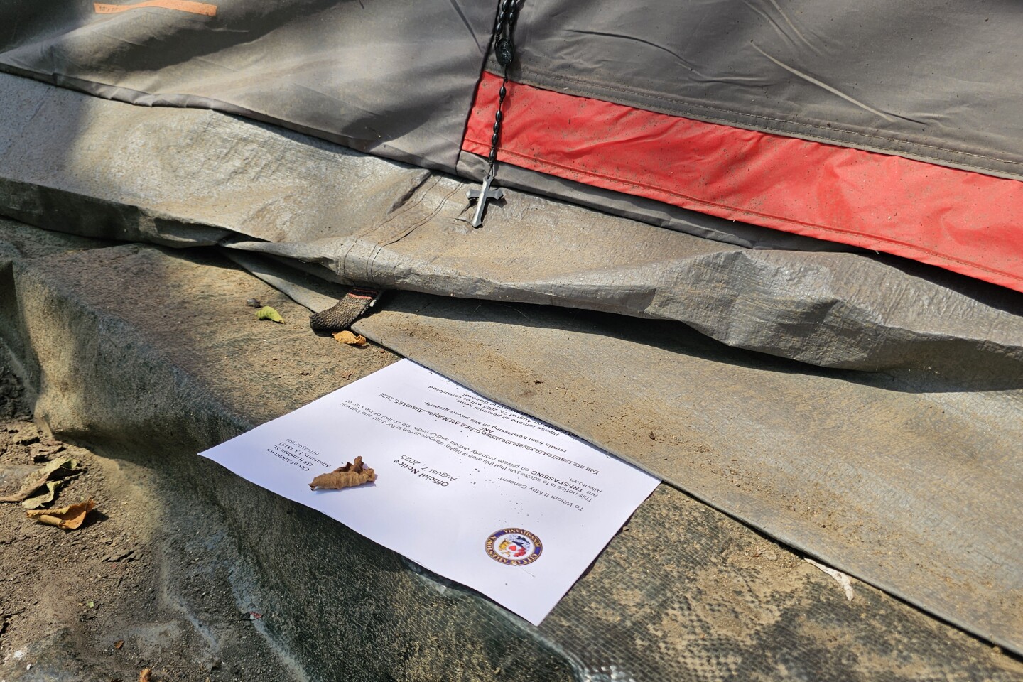 Allentown officials placed a trespassing notice Thursday, Aug. 7, at the entrance to the tent of an elderly woman who recently died there, according to residents. A rosary hangs from her tent. (Jason Addy)