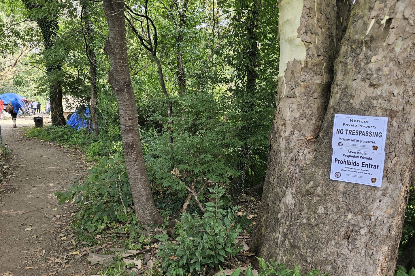 Allentown officials posted formal no-trespassing signs on the morning of Thursday, Aug. 7, at the entrance to a homeless encampment along Jordan Creek. Residents must vacate the area by Aug. 25, according to the city. (Jason Addy)