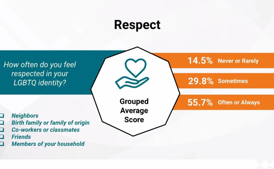 More than half of respondents often or always feel respected in their LGBTQ identities, and 14.5% never or rarely feel respected, the study found.