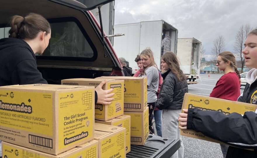 The members, leaders and parents of New Tripoli’s Girl Scout Troop 6741 were among the first around Lehigh County to arrive at the Saturday drop-off of over 6,800 pre-ordered cases of the signature treats.