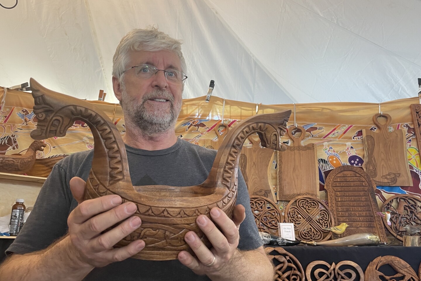 Joel Zanni with Blue Frogs Company shows off one of his prized works at the 37th showing of the Celtic Classic festival in Bethlehem. (Will Oliver)