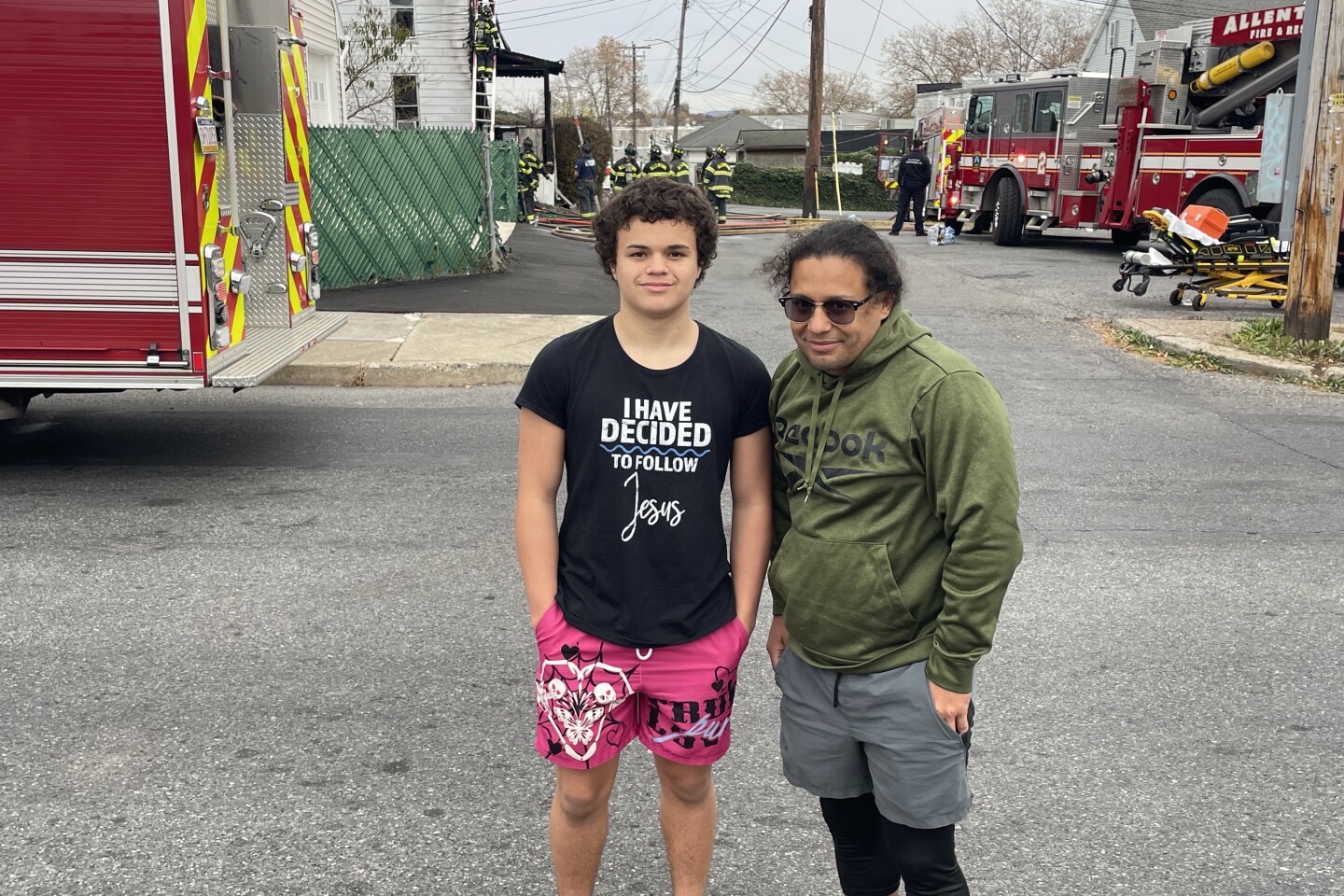 Coopersburg father and son, Marcos Rivera, right, and Isaac Santos, a 16-year-old volunteer firefighter with the Coopersburg Fire Company, acted quickly when they noticed smoke coming out of the basement window underneath the front porch. Rivera banged on doors to make sure no one was inside while Santos grabbed a garden hose and started dousing dried brush alongside the home. (Christine Sexton)