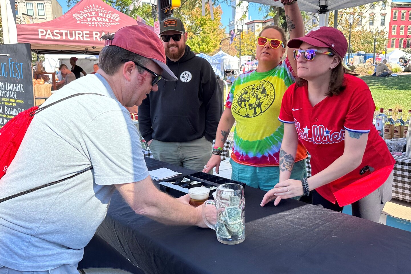 A customer orders a garlic beer from Two Rivers Brewing at Easton Garlic Fest. (Brian Myszkowski)