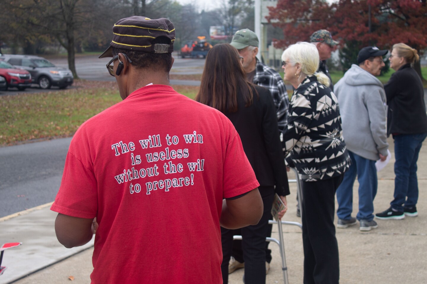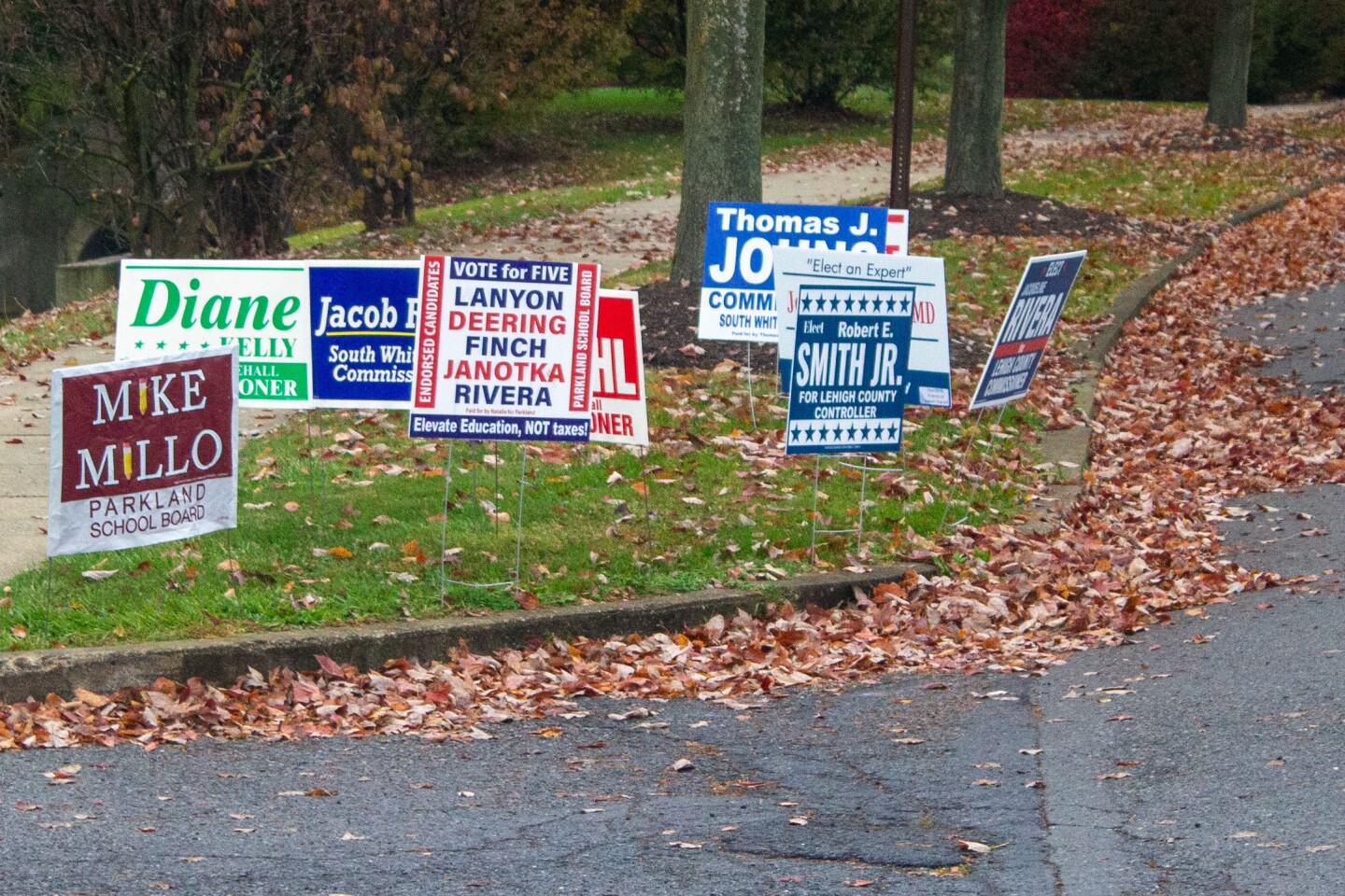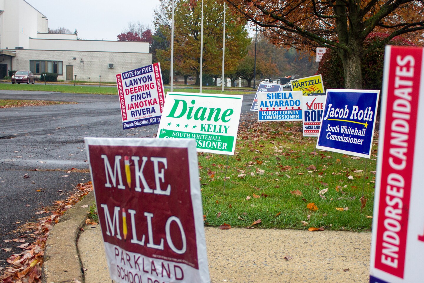 A mix of election signs outside the Calvary Temple polling station in Whitehall on Tuesday, Nov. 7, 2023. (Julian Abraham)