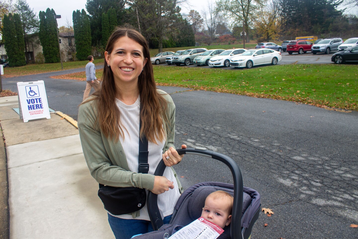 Alexandra Lamperti and her baby, Camille, in Whitehall. Alexandra said she was mainly there to vote in the school board election for the Parkland district, where she is raising a family, and concerned for the future of her kids. (Julian Abraham)