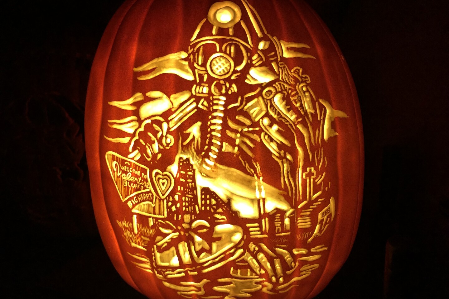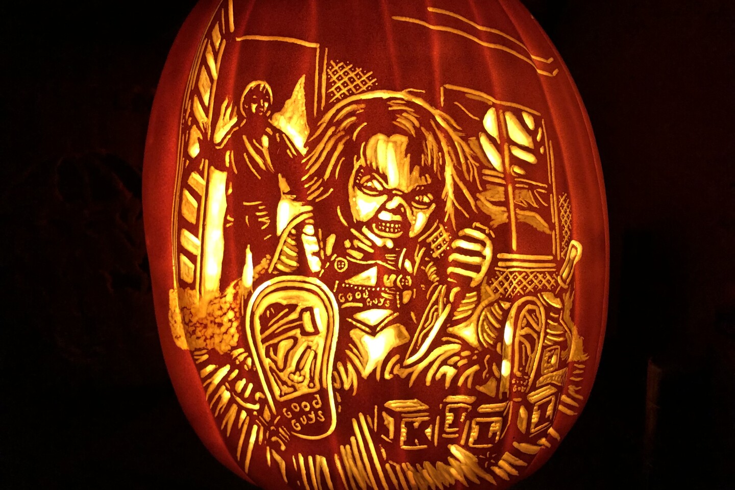 It can take hours or even days for Ian Fetterman, of Palmer Township, to meticulously carve intricate scenes onto the skin of foam pumpkins. Original artwork by Justin Osbourn. (Courtesy)