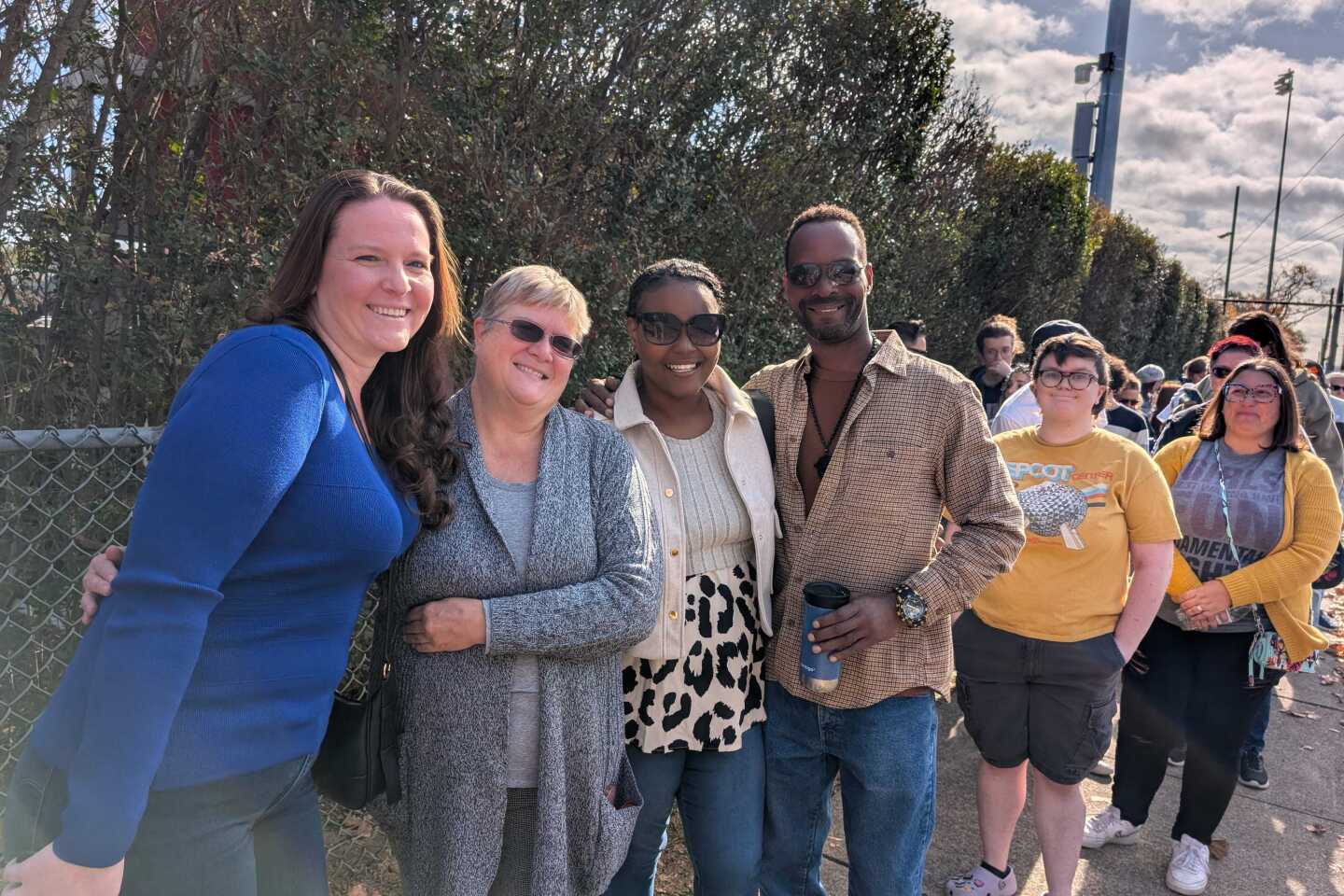 Kamala Harris supporters Christina Meyer, Deb Zelenack, Qia Walters, and James Jones in line Monday at Muhlenberg College in Allentown. (Jay Bradley)