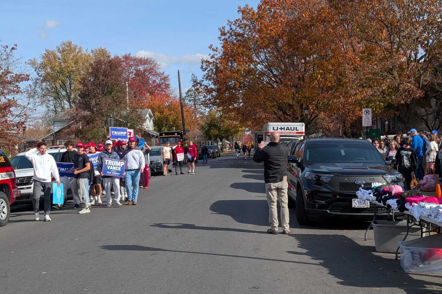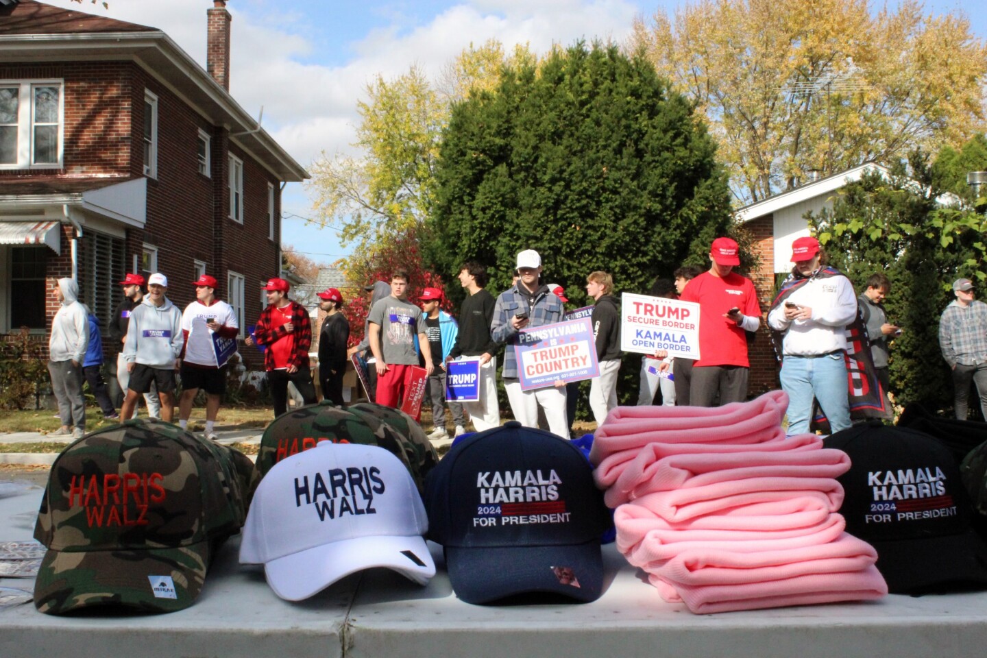 A small group of Donald Trump supporters opposite a line of Kamala Harris supporters outside a rally for the Vice President at Muhlenberg College in Allentown on Monday, Nov. 4, 2024. (Jay Bradley)