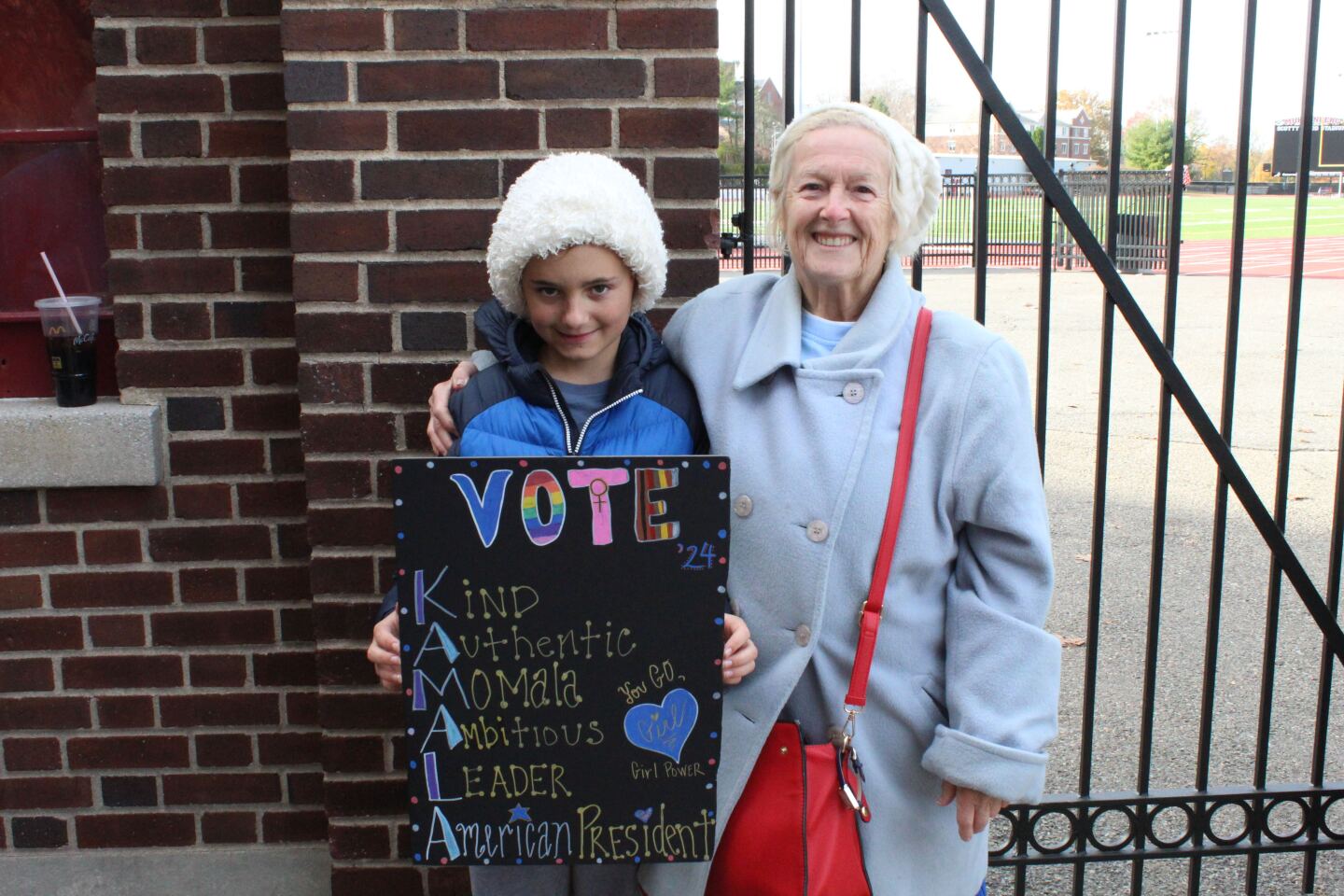 Allentown resident Elizabeth Slaby (right), with her grandson, was the first person in line for the Kamala Harris rally at Muhlenberg College. (Stephanie Kasulka)
