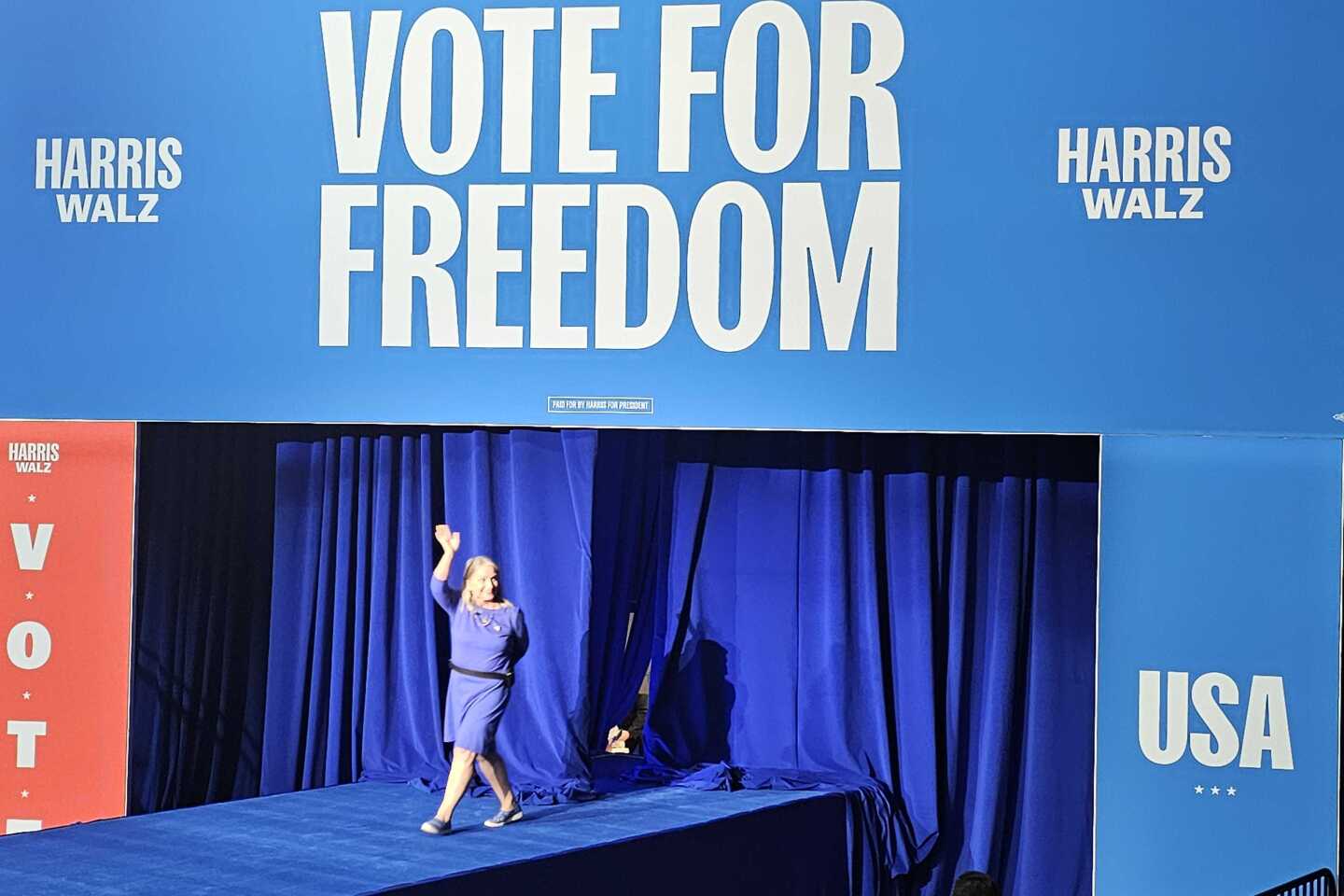 U.S. Rep. Susan Wild enters the stage at Muhlenberg College ahead of Vice President Kamala Harris' visit. (Jason Addy)