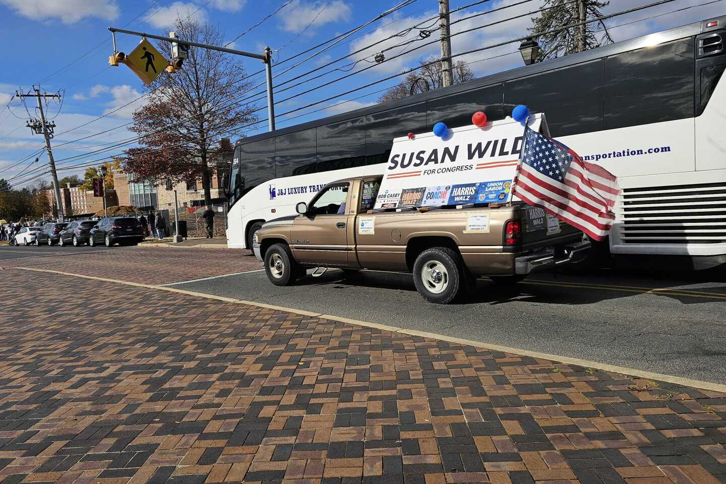 A truck driver shows support for Congresswoman Susan Wild outside of a rally for Vice President Kamala Harris on the campus of Muhlenberg College in Allentown on Monday, Nov. 4, 2024. (Jason Addy)