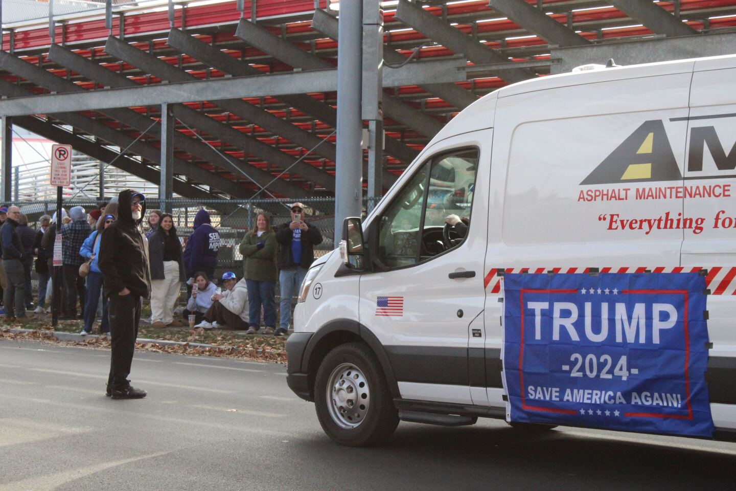 An asphalt maintenance solutions van with Donald Trump flags attached drove past hundreds of Kamala Harris rally attendees lined up on the sidewalk. Kevin Kennedy, wearing a Harris hat, stepped into the road to stop the vehicle. (Stephanie Kasulka)