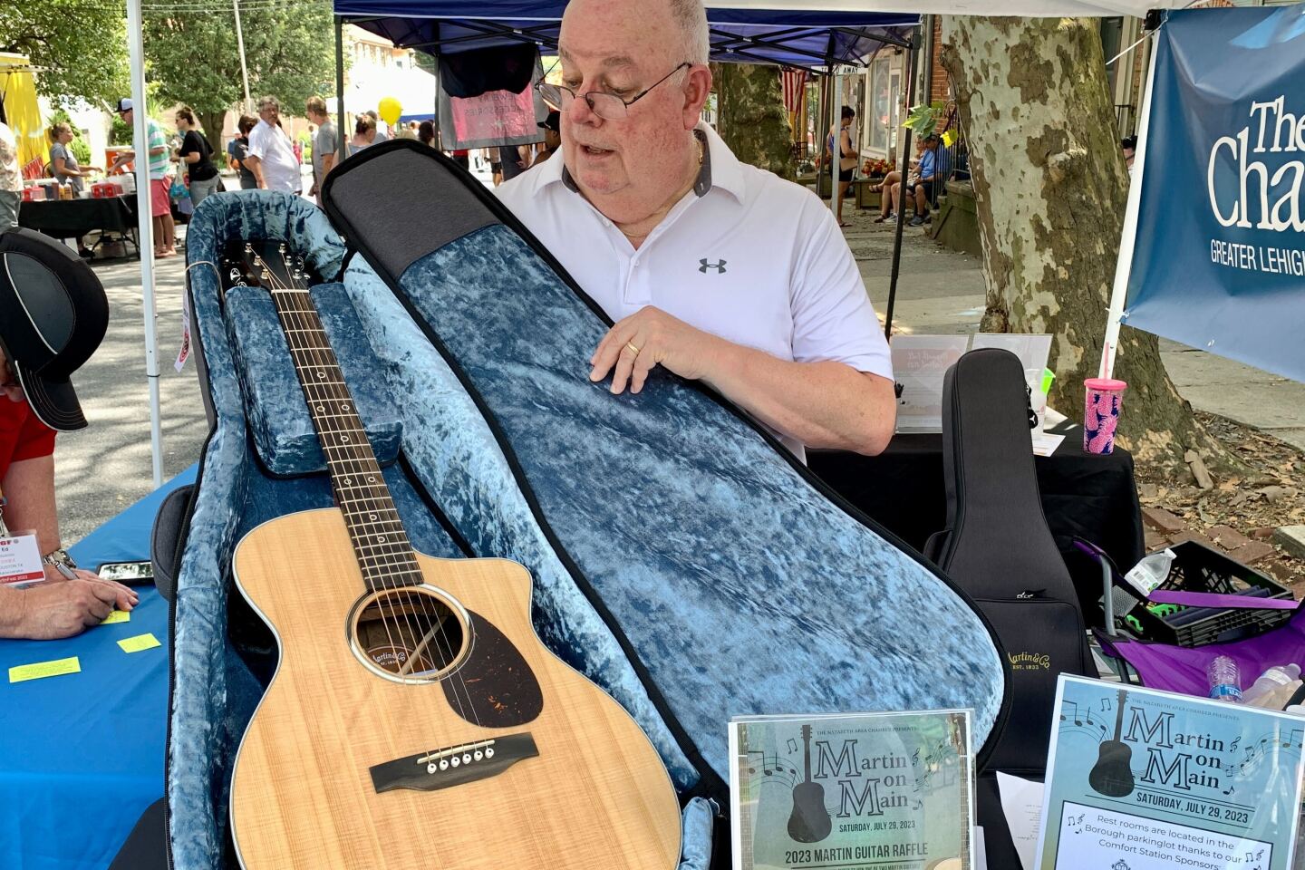 Board member of the Nazareth Area Chamber of Commerce Bill Skinner shows off one of the guitars that was raffled at the event. (Olivia Marble)