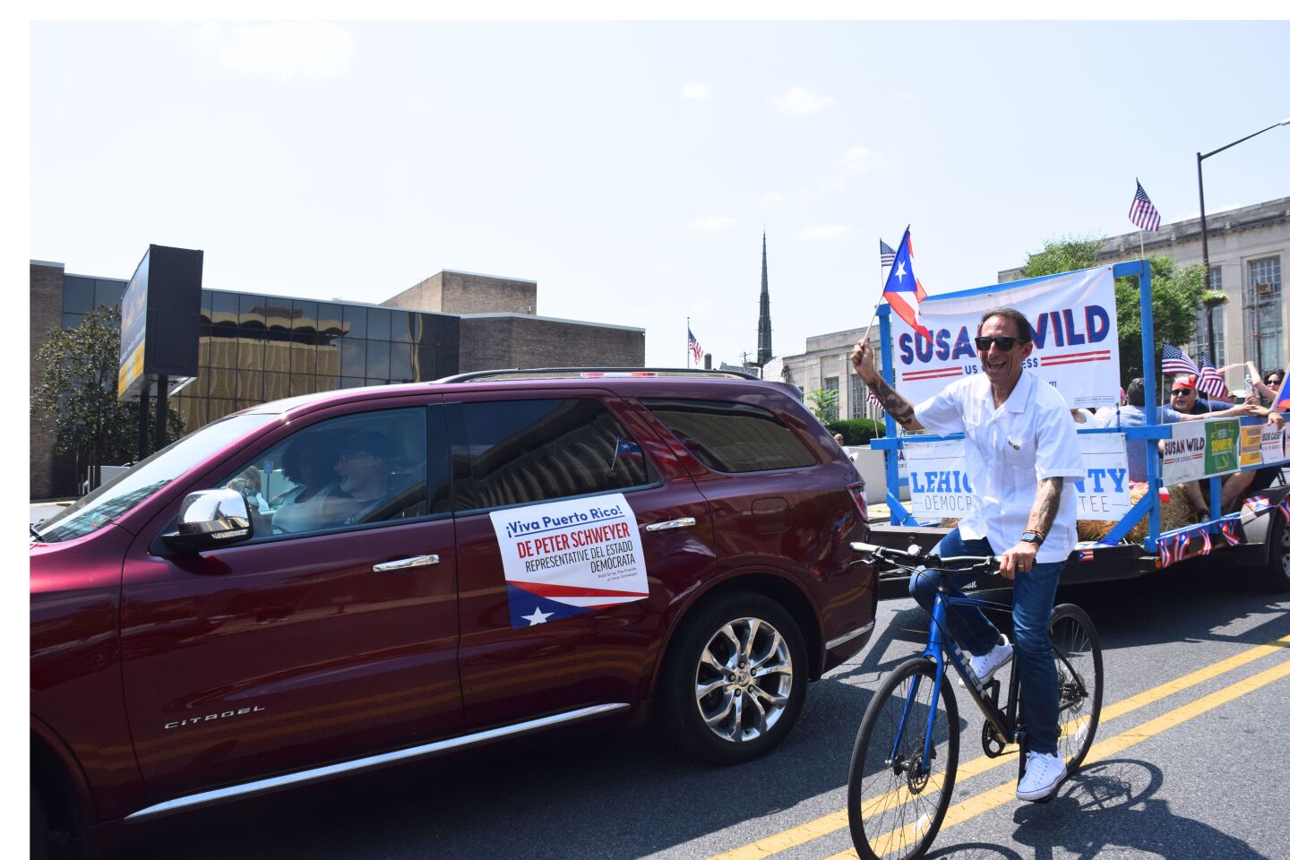 Guillermo Lopez (waving) rides on a float with Democrats including U.S. Rep Susan Wild at Allentown's Puerto Rican parade on July 28, 2024. (Micaela Hood )