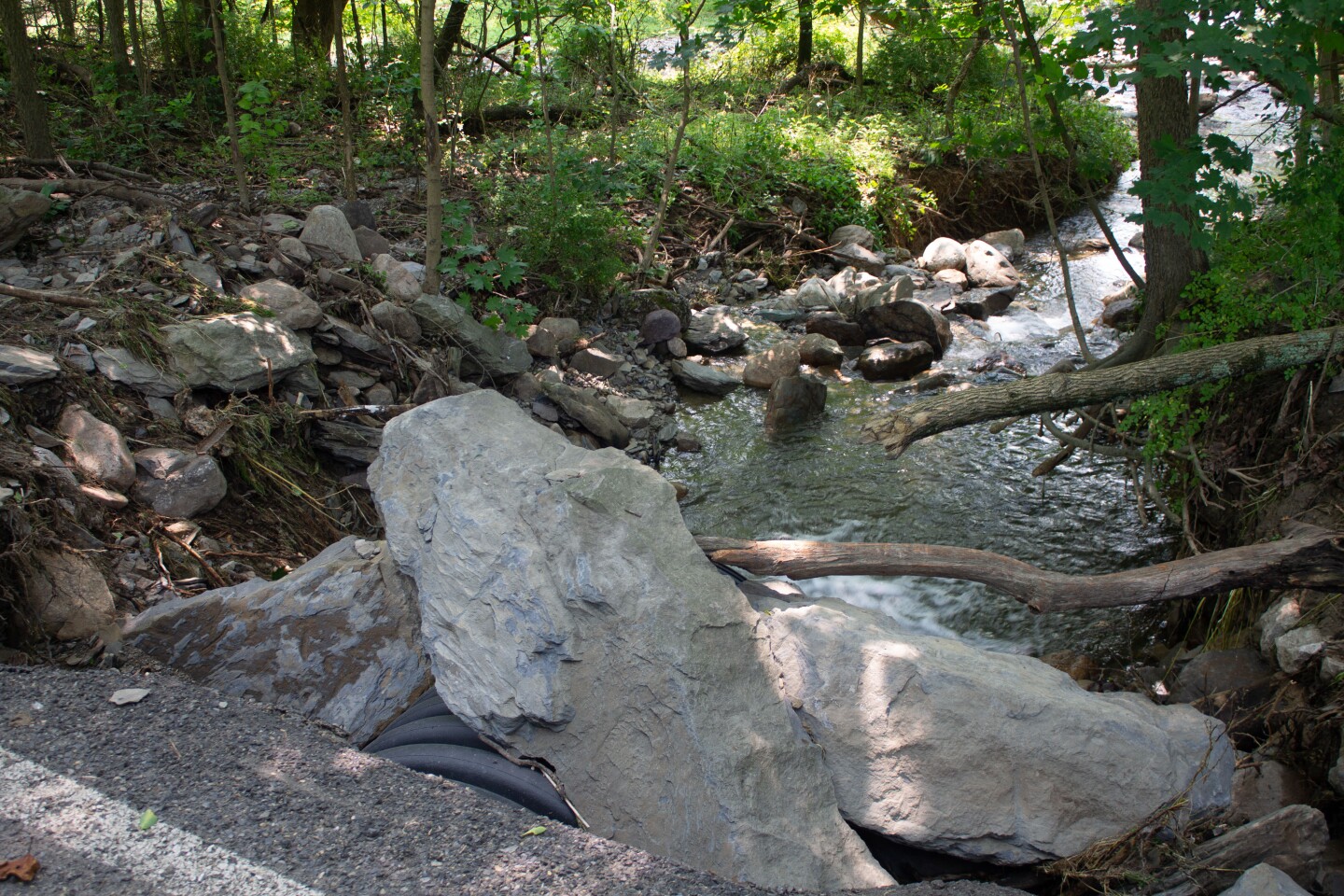 Giant rocks moved by the water, luckily leaving the drain pipe unblocked. (Julian Abraham)