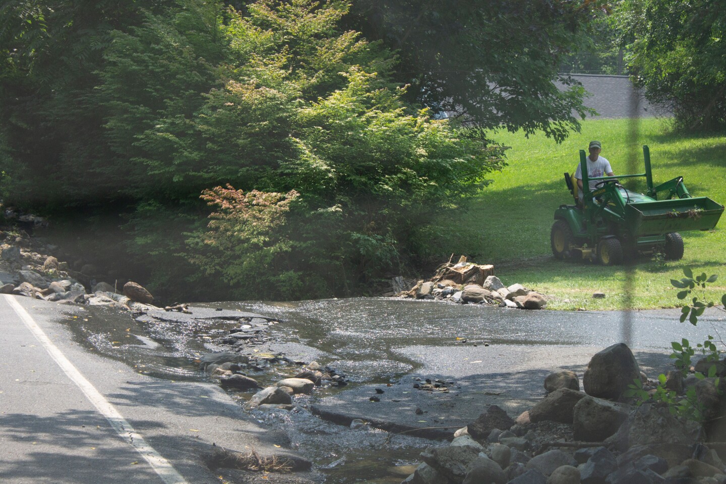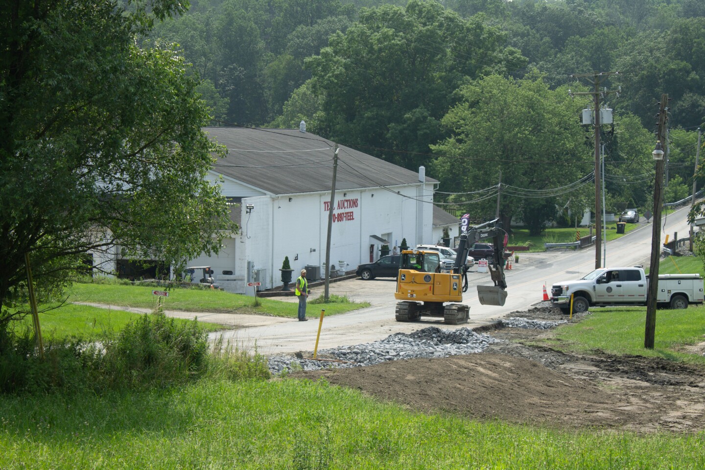 Township workers repair the damage to the roads near the local auction house. During flooding, much of this area was completely underwater. (Julian Abraham)