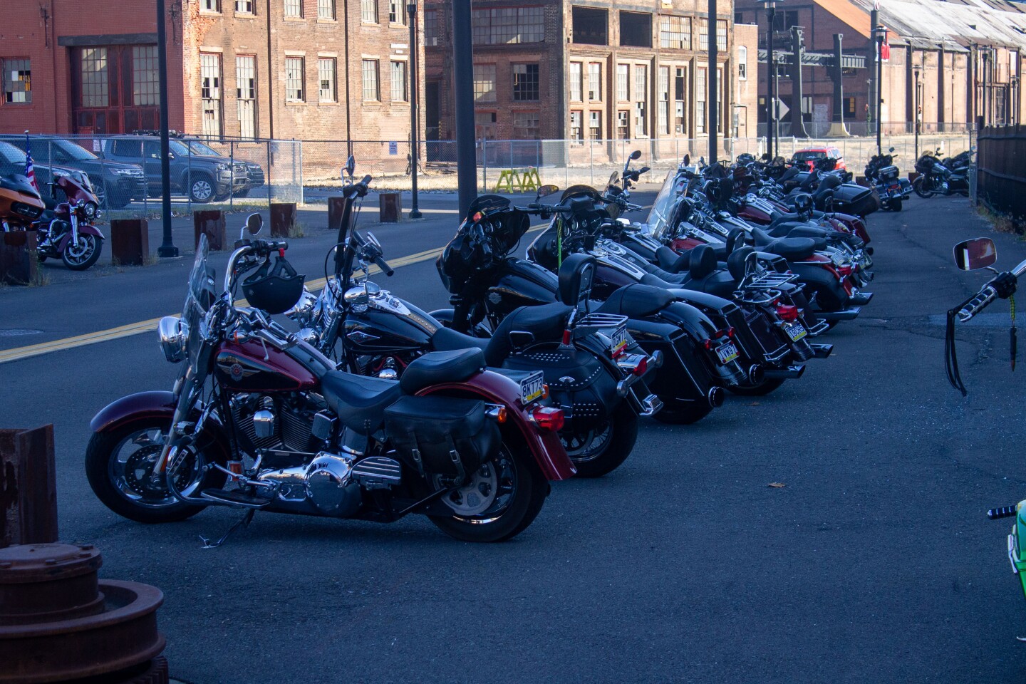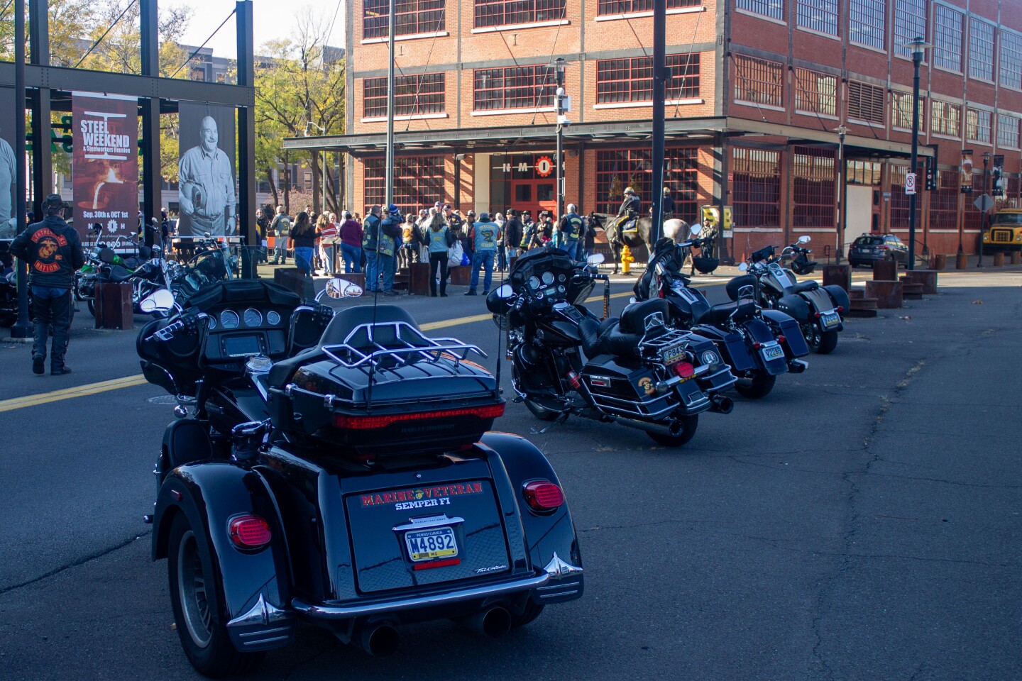 A group of veterans' motorcycles sit outside the Steel Stacks. (Julian Abraham)