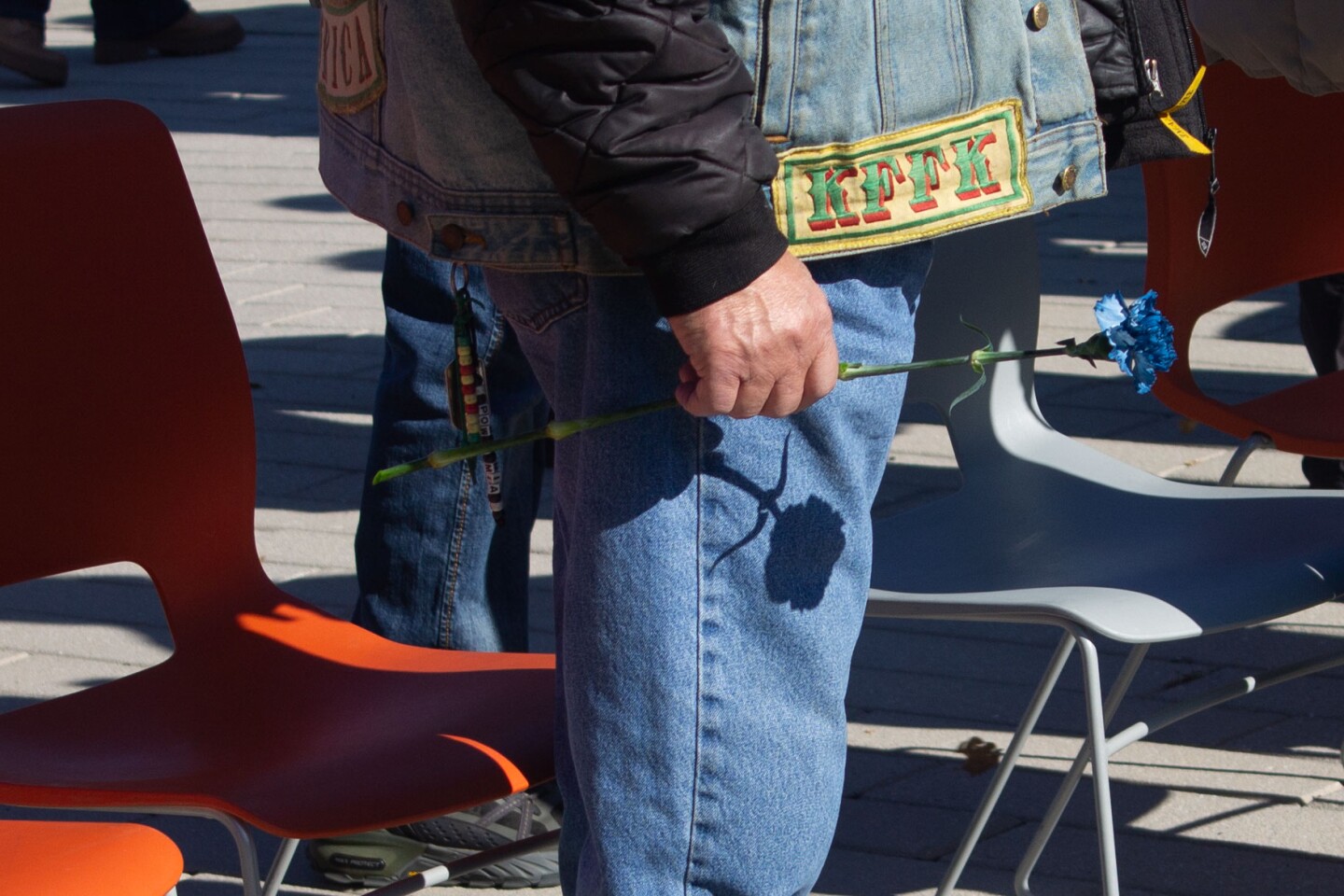 A member of the Nam Knights group holds a blue rose. (Julian Abraham)